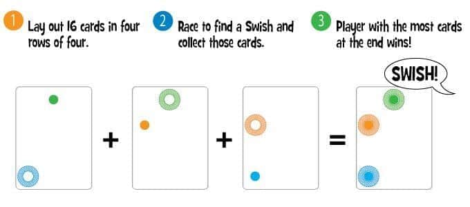 סוויש זהו תיאור הקול ששומעים כשהכדור נכנס לסל בצורה חלקה. הסוויש שלכם, הוא התאמה של מספר קלפים המונחים אחד על השני, כך שכל כדור נכנס לטבעת באותו הצבע. הקלפים שקופים, מותר להפוך אותם ולסובב לכיוונים שונים, אבל אסור שיישאר כדור ללא טבעת, או טבעת ללא כדור. המטרה: לצבור הכי הרבה קלפים.