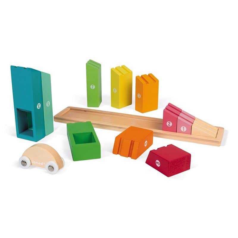 משחק בנייה (הרכבה) מורכב מ-10 קוביות אותן יש להחזיר למקומן בסדר עולה על הביס שלהם במטרה ליצור מדרון. כל קובייה ממוספרת מ-1 עד 10 במטרה ללמוד את סדר הגודל. ברגע שהמדרון הושלם, המכונית יכולה לרדת במדרון במטרה לבדוק שאין טעויות, ולאחר מכן ניתן לאחסן אותה במוסך מתחת לקוביות האחרונות! עץ: עץ אשור. תיבה צבעונית סגורה.