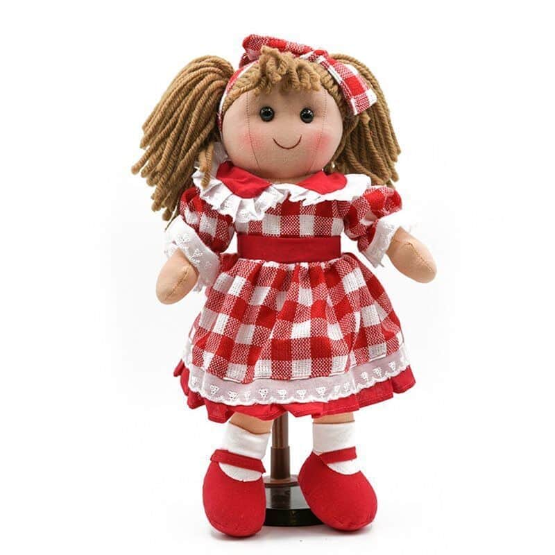 בובה אנושקה רכה מבד כמו של פעם בשמלת משבצות אדומה.