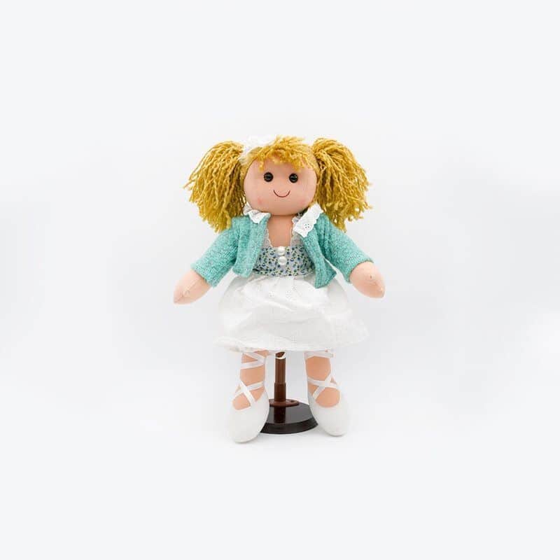 בובה אנושקה רכה מבד כמו של פעם לבושה חצאית לבנה עם ג'קט טורקיז.