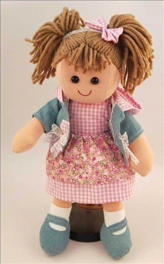 בובה אנושקה רכה מבד כמו של פעם לבושה בג'קט ג'ינס.