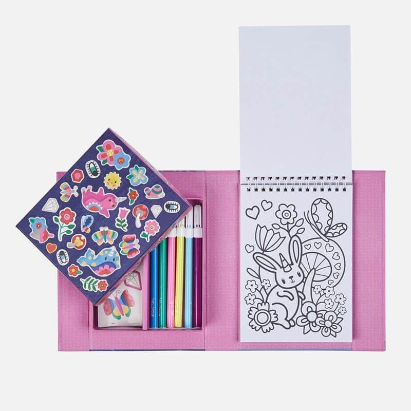 הערכה הכוללת: 10 טושים, 5 דפי מדבקות, 48 דפי עבודה וצביעה שונים, קופסת אחסון.