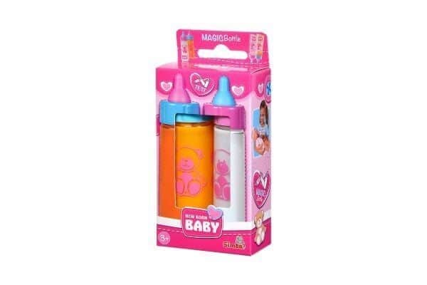 זוג בקבוקי האכלה לבובה הכוללים בקבוק חלב ובקבוק מיץ