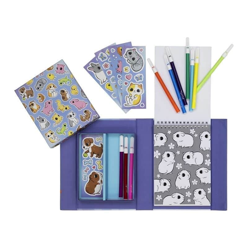 הערכה הכוללת: 10 טושים, 5 דפי מדבקות, 48 דפי עבודה וצביעה שונים, קופסת אחסון.
