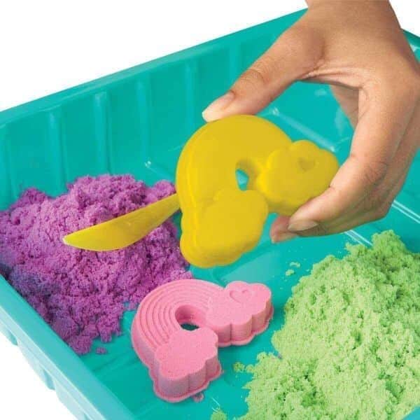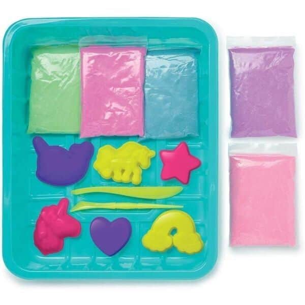 מכיל 5 מיכלים של חול קינטי בצבעים שונים, וכל האביזרים ליצירת חדי קרן, קשת, ועוד.