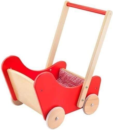 עגלת עריסה לתינוק עשויה עץ איכותי מבית ויגה VIGA מתאימה לבובות בגדלים שונים. על גבי גלגלי העץ פסי גומי למניעת החלקה ולנסיעה שקטה. עגלה מצוינת למשחק תפקידים.