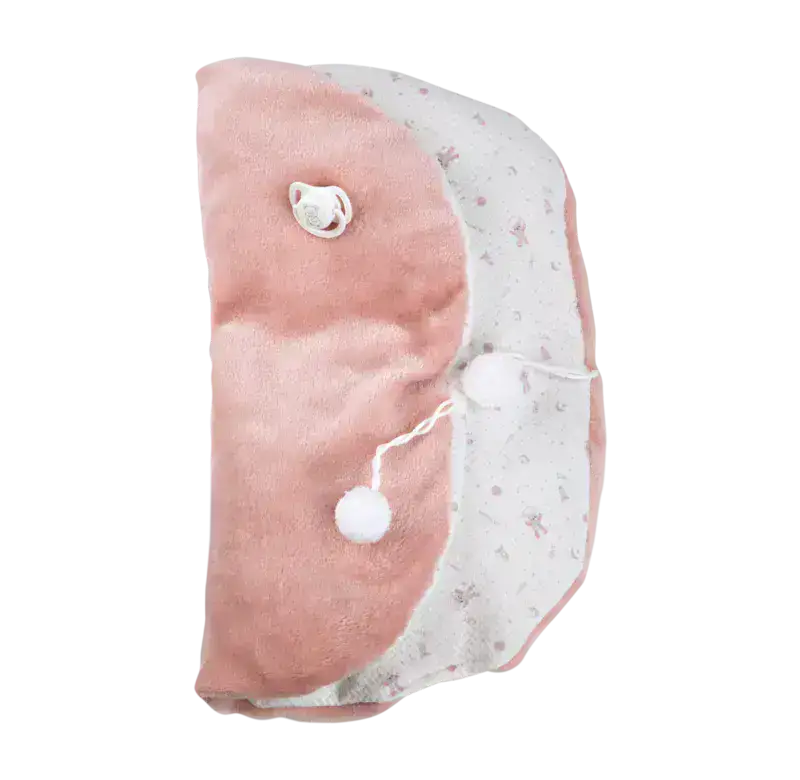 מגיעה עם שמיכת פרווה ורודה חליפה לבנה עם איורים ורודים ומוצץ