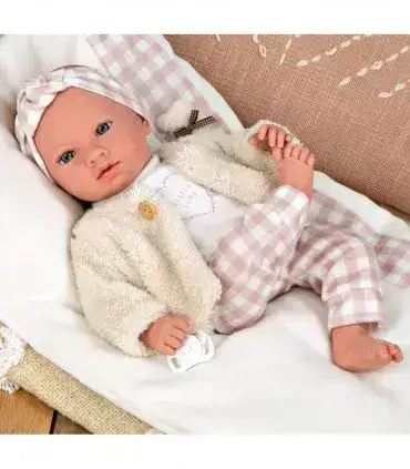 בובת תינוקת עם כרית לבנה עם משבצות ורודות