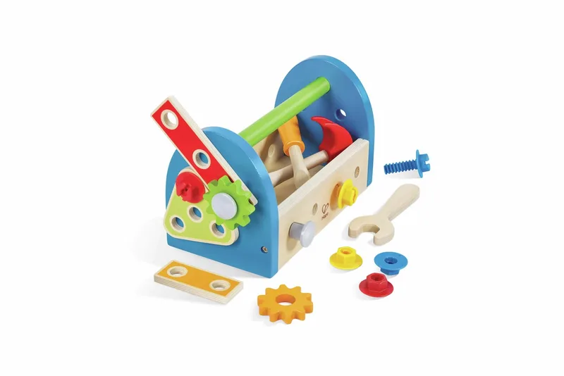 ארגז כלים מעץ מכיל אומים, ברגים וכל הכלים שבנאים קטנים אוהבים.