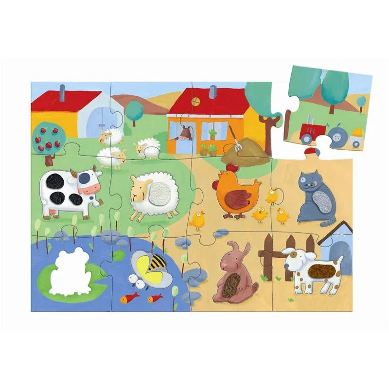 פאזל של 12 חלקים של חיות החווה, שבנוסף ניתן להרכיב בנפרד כל חיה ולמשש אותה.הפאזל עם חלקים קשיחים, עמידים ונוחים לשימוש, עשויים קרטון מהרמה הגבוהה בעולם. עוד מוצר מיוחד ומעוצב של חברת DJECO