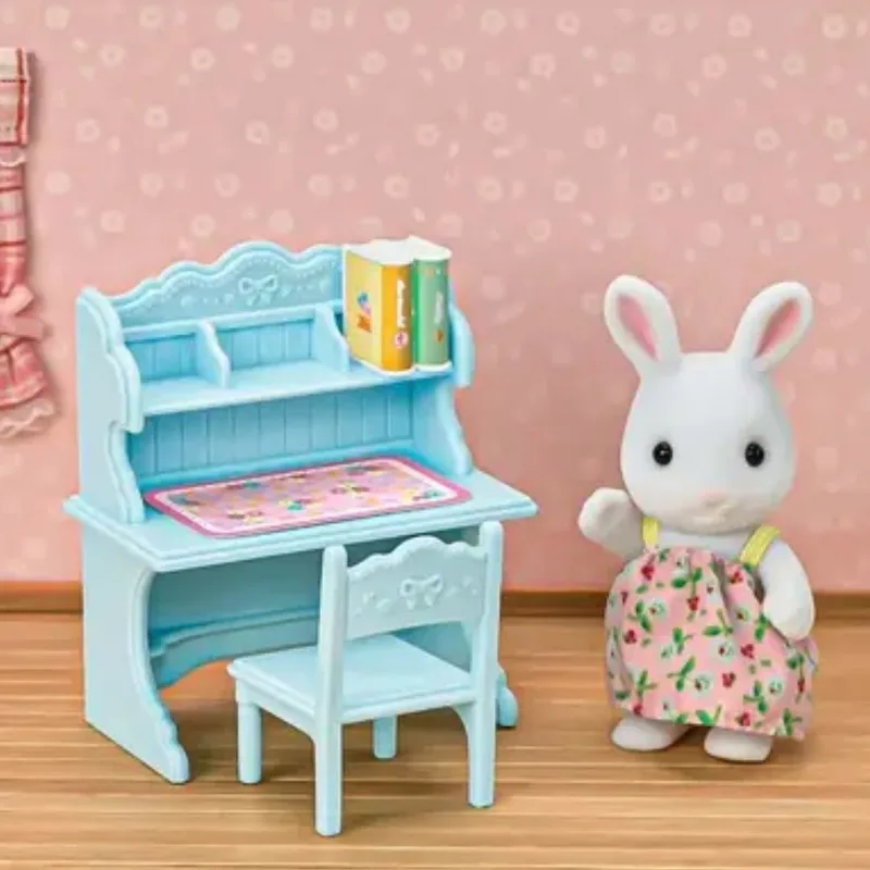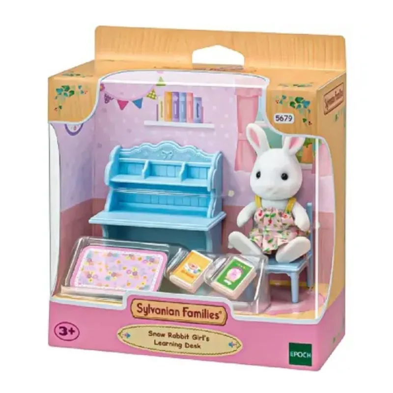 סט שולחן לימוד לילדת ארנבת השלג – מייזי ,כולל שולחן כתיבה בצבע כחול פסטל עם מקום למשטח שולחן ומדפים לספרי לימוד. כמו כל הדמויות בסילבניאן גם מייזי יכולה להזיז את הידיים, הרגליים והראש, והיא לבושה בבגדי בד הניתנים להסרה. גילאי: 3+