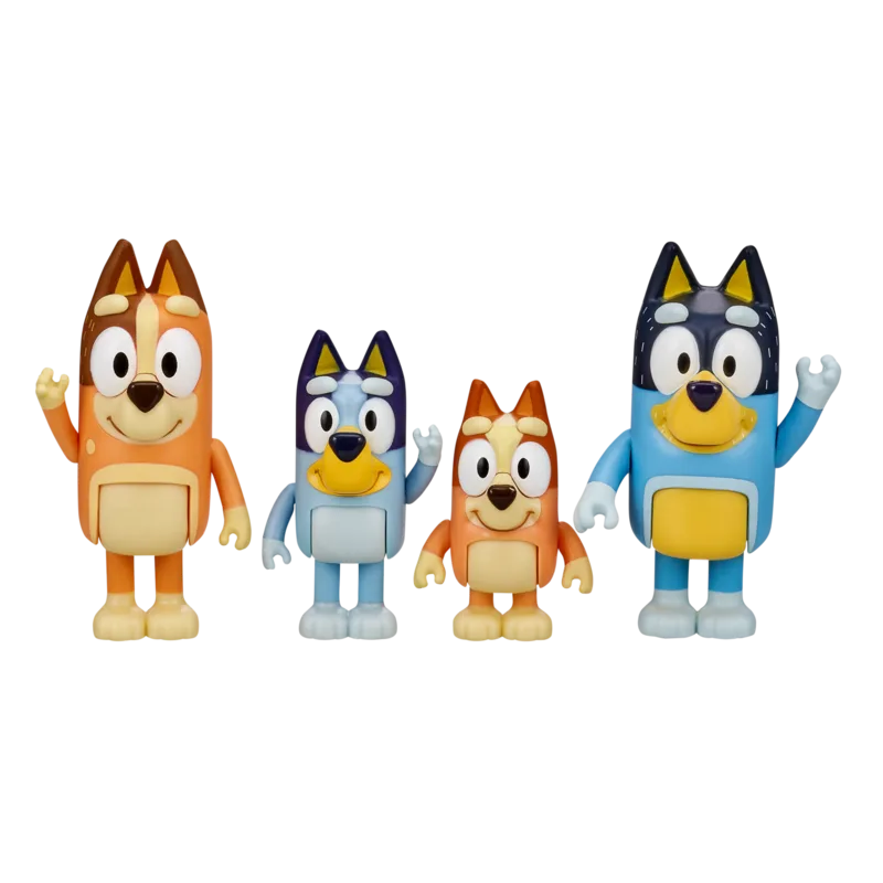 חבילת 4 דמויות משחק הכוללת את ארבעת חברי משפחתה של בלואי -בלואי Bluey, בינגו Bingo, בנדיט Bandit (אבא), צ'ילי Chilli (אמא)