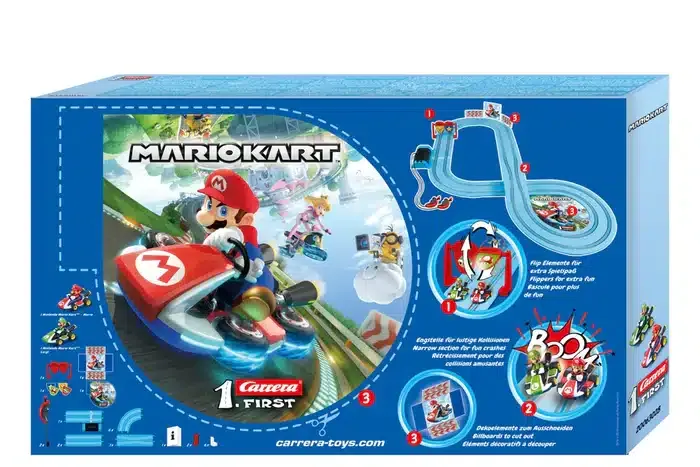 Carrera FIRST – Mario Kart “Mario vs. Luigi סט מירוץ התחלתי בקנה מידה 1:50 באורך כ‑2.9 מטר, עם שני רכבי מריו ולואיג׳י.