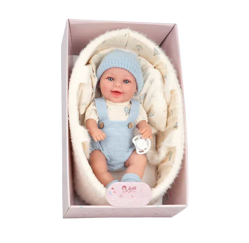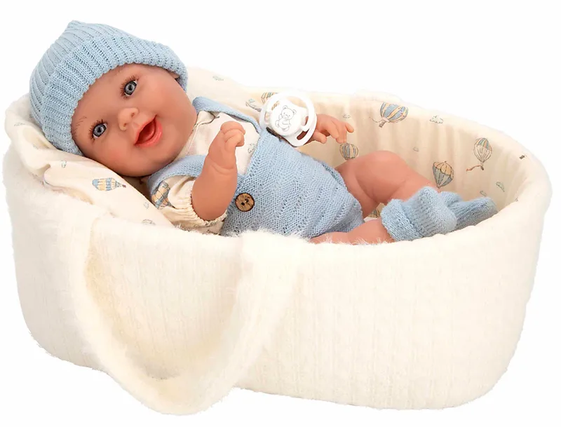 בובת תינוקת עם עריסה ומוצץ לבושה באוברול וכובע בצבע תכלת