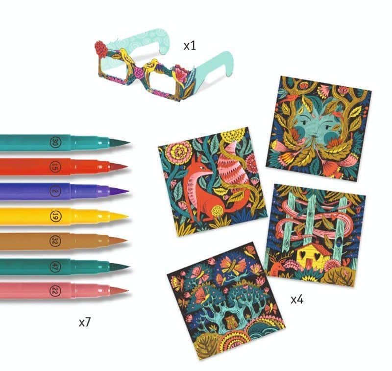 ערכת יצירה ובה ארבע תמונות שונות וטושים מיוחדים דו צדדיים לאחר הצביעה מסתכלים עם המשקפיים ומקבלים תמונת תלת מימד