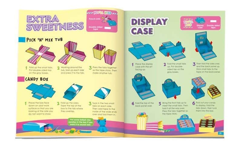 עגלה ומתקני תצוגה מקרטון קשיח להרכבה ו- 32 עמודי הדרכה והשראה מאוירים.