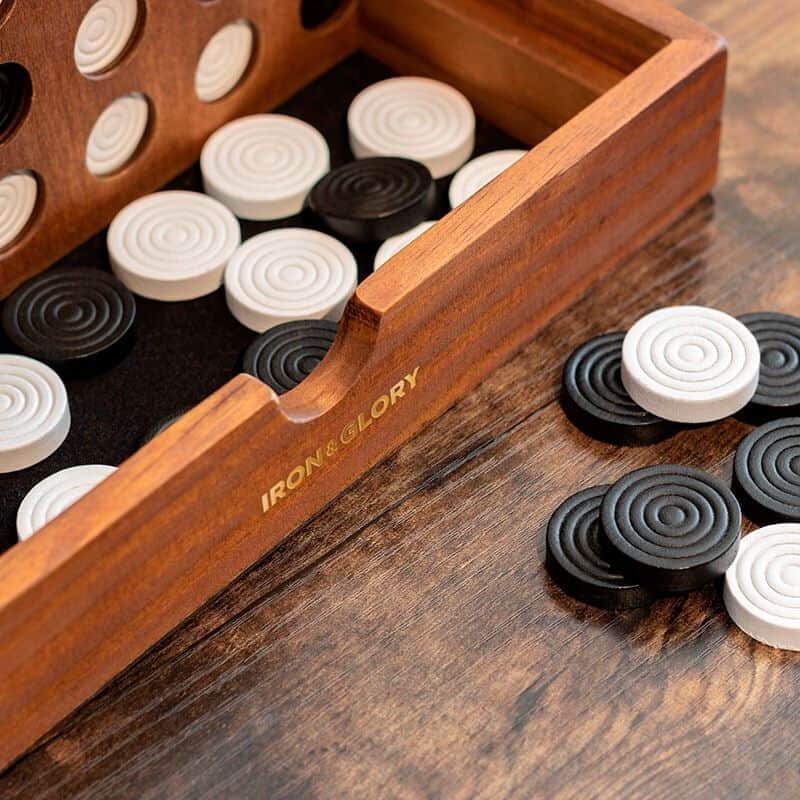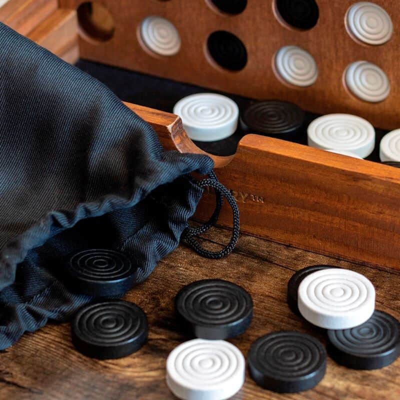 כולל לוח עץ יוקרתי , 42 כלי משחק מעץ, תיק כותנה ומדריך משחק.
