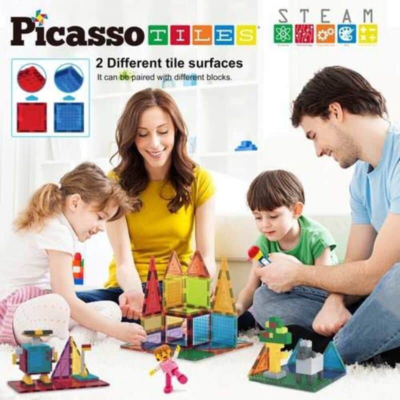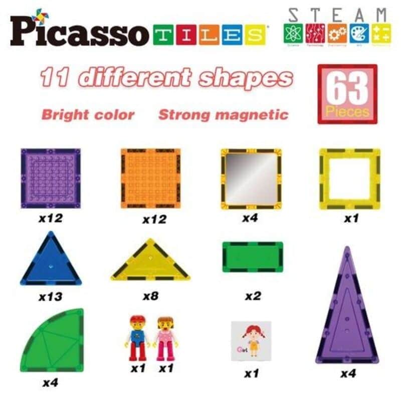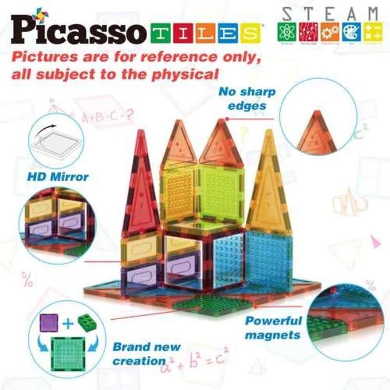 אריחי המגנטים של פיקאסו מבוססים על גישה ללימוד תכנים באמצעות חוויית משחק ע"י עקרונות למידה של: מדע, טכנולוגיה, הנדסה, אומנות, מתמטיקה. חוויית המשחק מעודדת: חשיבה יצירתית כבסיס לפתרון בעיות, חשיבה ביקורתית וחדשנות, ומכינה את הילדים לסביבה טכנולוגית עם הקניית כלים אמיתיים לחיים. הדגם מאפשר לילדים לבנות ולהרכיב דגם בתלת מימד באופן חופשי ולפתח חשיבה הנדסית ויצירתית. הדגם כולל 63 חלקים מגנטיים ב-10 צורות שונות, 2 דמויות מגנטיות ולבני הרכבה ייחודיות עם פני שטח בולטות התואמות אבני לגו. הדגם מתאים לערכות נוספות, וניתן להרחיב אותו לשילובים גדולים יותר לאין שיעור.
